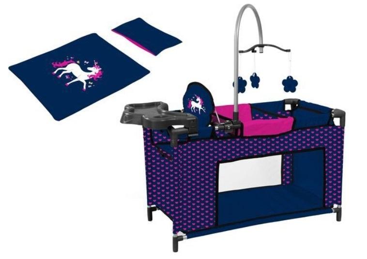 Lóżko dla lalek oferuje niezliczone możliwości zabawy. W zintegrowanym wysokim krzesełku można wygodnie karmić lalki dzięki tacy jadalnej. Do przechowywania akcesoriów lalki lóżko zawiera przegródkę, która można łatwo zamknąć i otworzyć dzięki zapięciu na rzepy. Dzięki dołączonym do zestawu wieszakom (3 sztuki) ubranka lalki można powiesić. Dodatkowo za siedziskiem przewidziano miejsce do przewijania lalki. Dzięki mobilowi lalka jest zawsze zabawiana podczas przewijania. Dołączona do zestawu poduszka i kocyk zapewniają lalce przytulny sen.