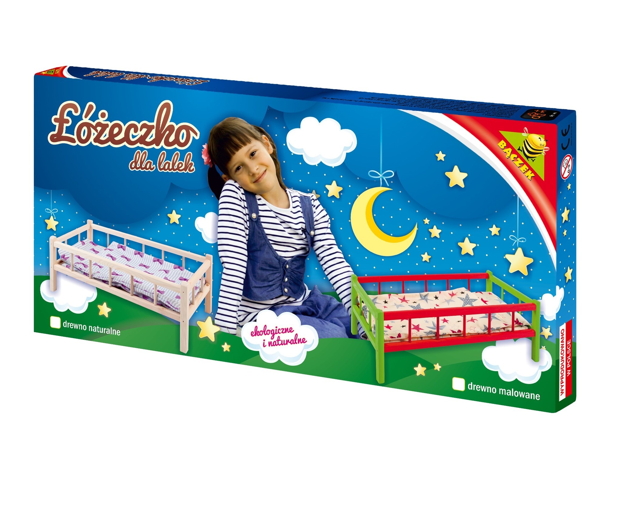 Łóżeczko charakteryzujące się prostotą a zarazem trwałą i wytrzymałą konstrukcją. Solidny spód pomieści lalkę do 55 cm. Wykonane starannie i estetycznie z ekologicznego drewna. Łóżeczko pakowane jest w pudełko w elementach do samodzielnego montażu. Łóżeczko w komplecie zawiera 3-elementową dwustronną pościel: materacyk, poduszeczką i kołderka.