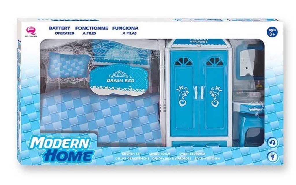 Sypialnia z toaletką, łózkiem i szafą, idealna do zabawy z lalkami.