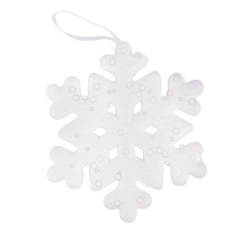 Styropianowa śnieżynka do zawieszenia ozdobiona błyszczącymi elementami. Wielkość 15 cm. 1 sztuka w opakowaniu.