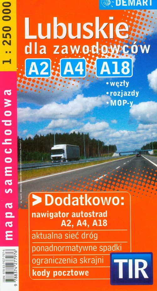Mapa przeznaczona jest nie tylko dla kierowców zawodowych (TIR-ów, ciężarówek,) ale i dla wszystkich innych kierowców, którzy dużo jeżdżą po Polsce. Ma rozbudowaną treść tematyczną przydatną kierowcom zawodowym: - nawigator autostrad A2, A4, A18 - aktualną sieć dróg - ponadnormatywne spadki z opisem stopnia nachylenia, - pionowe i poziome ograniczenia skrajni, - spis kodów pocztowych, Przedstawiona sieć dróg uwzględnia budowane odcinki: autostrad, dróg krajowych i wojewódzkich przewidzianych do użytku do końca 2013 roku.    Skala: 1:250 000