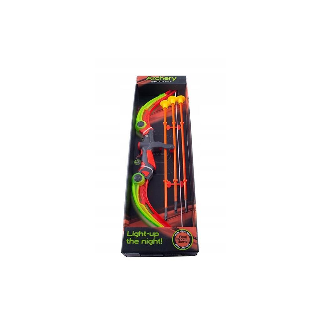Zabawka sportowa dla dzieci, które lubią rywalizację! Strzelanie do tarczy i liczenie punktów to wspaniała zabawa. Łuk ze strzałami to bezpieczna i zręcznościowa zabawka, jakim jest prezentowany Łuk ze strzałami. Tym razem to efektowna i świecąca w ciemności zabawka. Swoim wyglądem nawiązuje do prawdziwych sportowych łuków. Idealna  gra zręcznościowa dla dzieci ćwicząca refleks i precyzje. Zestaw świetnie nadaję się do zabawy na świeżym powietrzu.