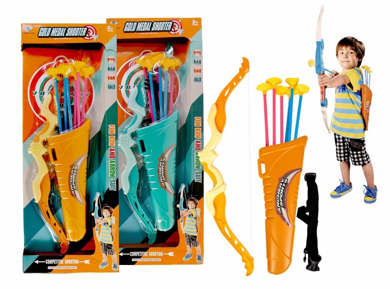 W zestawie: łuk dł: 54 cm, 6 strzał na przyssawki, kołczan na ramię, funkcje: z opakowania można wyciąć tarczę i strzelać do niej strzałami, strzały na przyssawki przyczepiają się do płaskiej gładkiej powierzchni, wym. opakowania: 24,5 x 63 x 4 cm, 2 kolory do wyboru, 3+