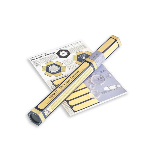 Historia Teleskopu Keplera: Johannes Kepler udoskonalił teleskop soczewkowy używany przez Galileusza, stosując do jego budowy dwie soczewki wypukłe, co znacznie zwiększyło pole widzenia teleskopu. Ceną za to był odwrócony obraz, co jednak nie przeszkadza w obserwacjach astronomicznych. Co więcej - był znacznie bardziej fascynujący! Opis: Zestaw do budowy małego teleskopu opisanego przez Johannesa Keplera. 10-krotne powiększenie jest wystarczające do obserwacji kraterów księżyca, a przy odrobinie szczęścia może nawet uda się dostrzec księżyce Jowisza. Kupując go w komplecie z Małym teleskopem Galileusza, będziesz mógł bezpośrednio porównać budowę i działanie dwóch różnych konstrukcji teleskopów. Pozwoli to docenić wynalazek Keplera i zrozumieć popularność tej konstrukcji. Rozmiar po złożeniu: 5 x 5 x 30 (do 45) cm Zawartość zestawu: 2 arkusze kartonu zawierające elementy do budowy teleskopu 3 soczewki OptiMedia 3, 7 i 9 polskojęzyczna instrukcja