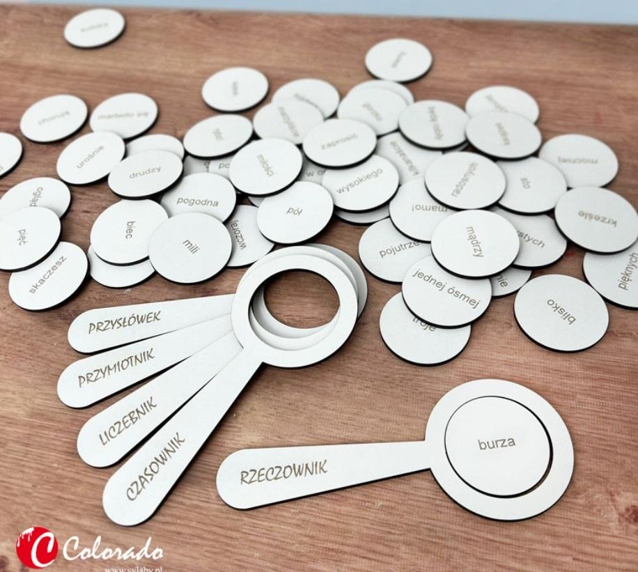 Zestaw zawiera 54 słowa + 5 lup z nazwami części mowy.