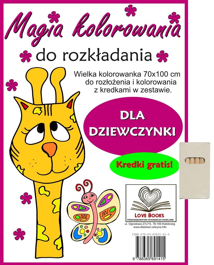 Magia kolorowania do rozkładania. Dla dziewczynki to cudowna plansza o wymiarach 70.0 x 100.0 cm do kolorowania. Planszę można rozłożyć na stole, podłodze lub powiesić na ścianie. Doskonała zabawa pobudzająca wyobraźnię i zachęcająca do aktywności. Kredki znajdują się w zestawie.