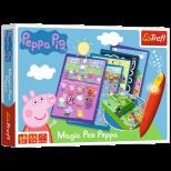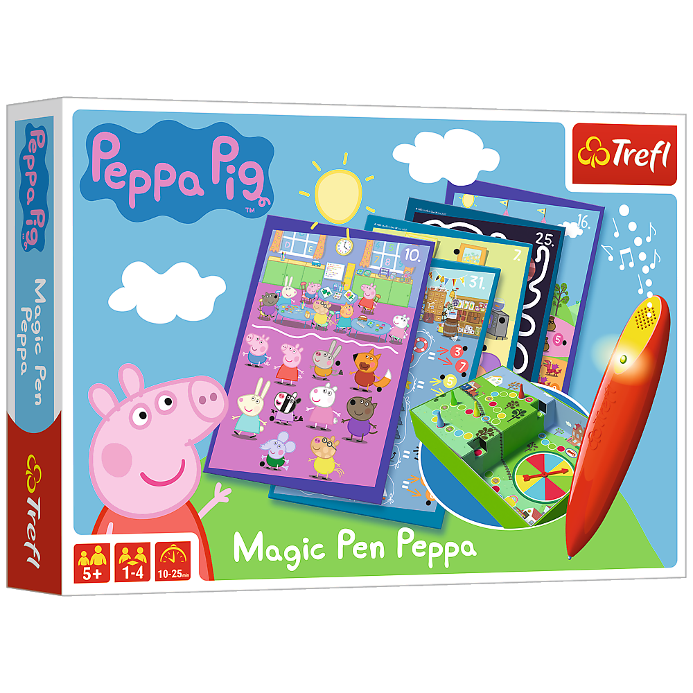 Magic Pen Świat Peppy to fascynująca gra, która stymuluje rozwój dziecka. Bawiąc się, dziecko ćwiczy spostrzegawczość, wyobraźnię i logiczne myślenie. Zawartość pudełka: 16 dwustronnych plansz magiczny pisak plansza do gry z tarczą losującą 4 pionki instrukcja Wiek 5+ Liczba graczy 1-4