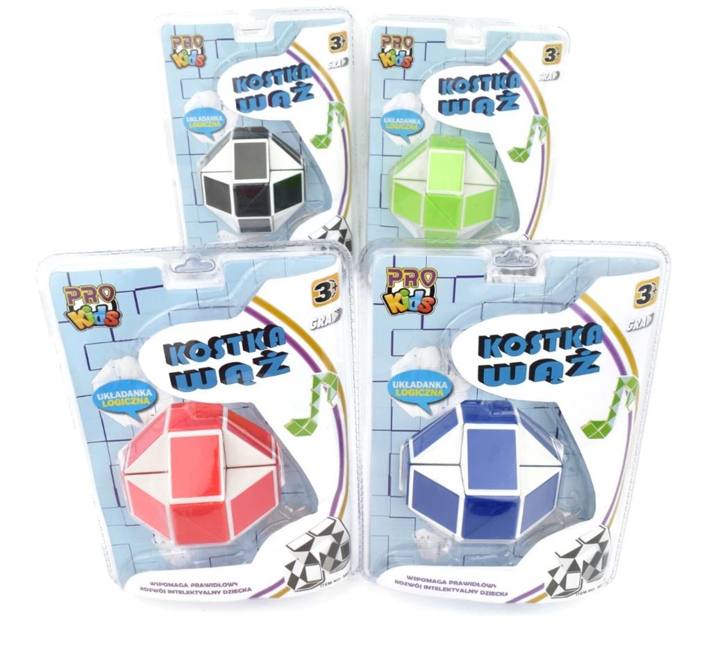 Kostka magiczna wąż. Zadaniem uczestnika jest ułożenie pomieszanej kostki, tak aby znowu doprowadzić do układu zamkniętego sześcianu. Gra umysłowa o średnim poziomie trudności. Kostką można układać różne kształty i wzory. Rozwija intelekt.