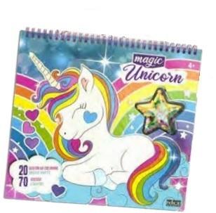 Album do rysowania z jednorożcem. Książka zawiera 20 stron do kolorowania oraz stronę naklejek.