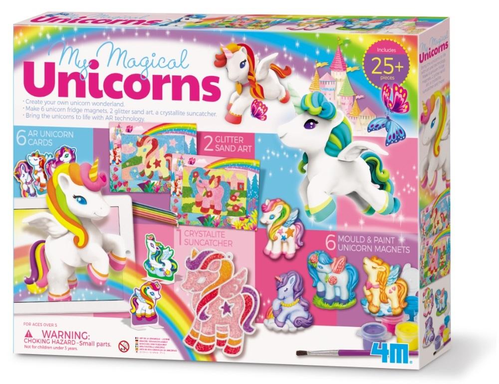 Stwórz własną krainę jednorożców. Zrób 6 magnesów na lodówkę, 2 rysunki z brokatowego piasku i kryształowy łapacz słońca. Na dodatek dzięki technologii AR możesz ożywić swoje jednorożce!