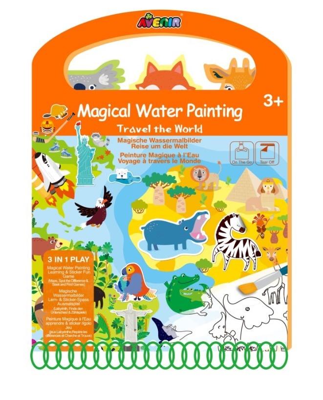 Magiczna książka do malowania wodą oparta na temacie odwiedzania miejsc nacałym świecie. Książeczka zawiera wiele zadań, takich jak labirynty, dostrzeganie różnic, szukanie i chowanie się. Zmocz pędzelek i przesuwaj po kartkach, aby odsłonić kolor. Wspaniały zestaw do ćwiczeń dla dzieci w podróży. Wiek 3 +.