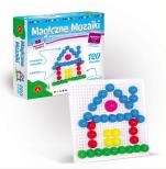 Magiczne Mozaiki"" to kreatywna zabawa dla dzieci, młodzieży i dorosłych.Do Waszej dyspozycji oddana zostaje plansza z mnóstwem otworów, w których należy umieścić różnej wielkości kolorowe elementy, by stworzyć rozmaite wzory i obrazy. Istnieje niemal nieskończona ilość kombinacji, a po wykonaniu ilustracji wystarczy,że wyjmiecie elementy i możecie zacząć od nowa.Do zestawu dołączony jest album zawierający ponad 100 inspiracji, Zabawa ćwiczy kreatywność i wyobraźnię.Zestaw zawiera 120 kołeczków o śr. 23 mm- 110 szt, 30 mm - 10 szt.