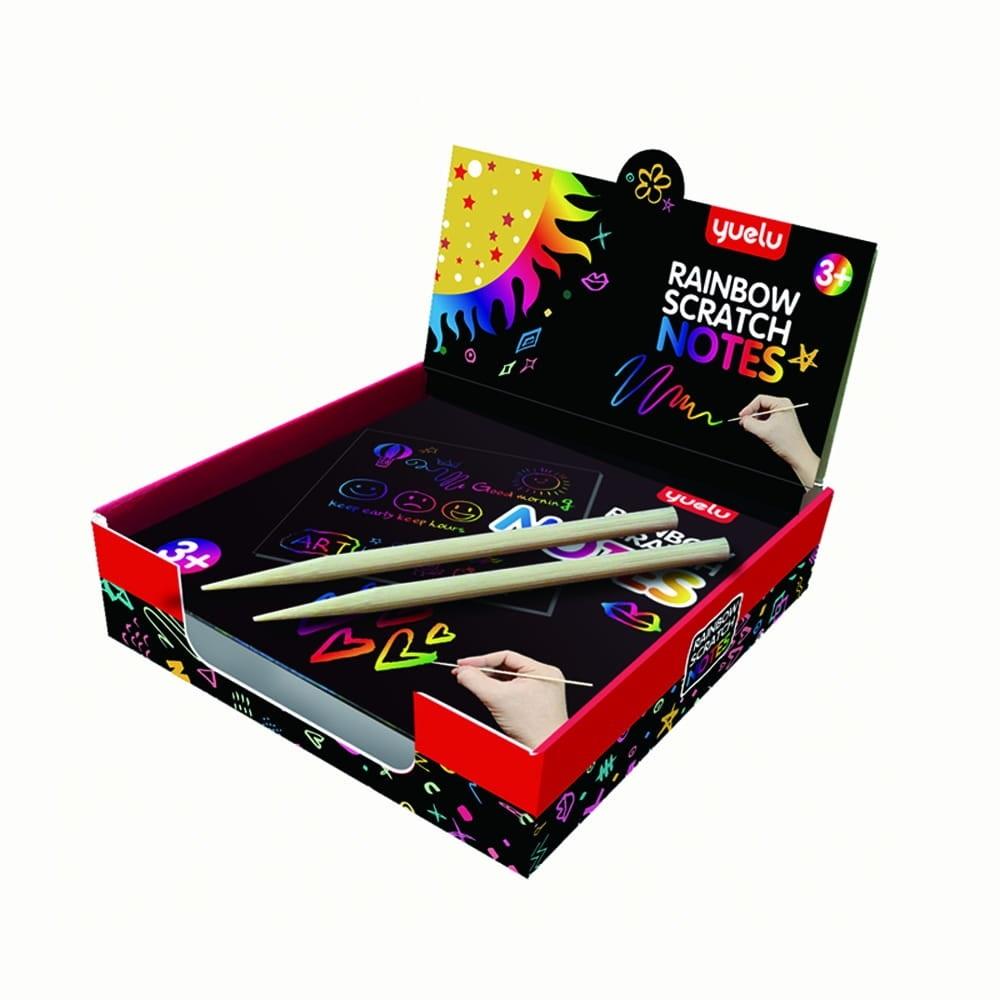 Karteczki pokryte są czarną powłoką, pod którą jest piękne kolorowe, tęczowe tło. Wydrapując rożne wzory, tworzymy niepowtarzalne wiadomości, kartki upominkowe czy nawet kartki świąteczne!