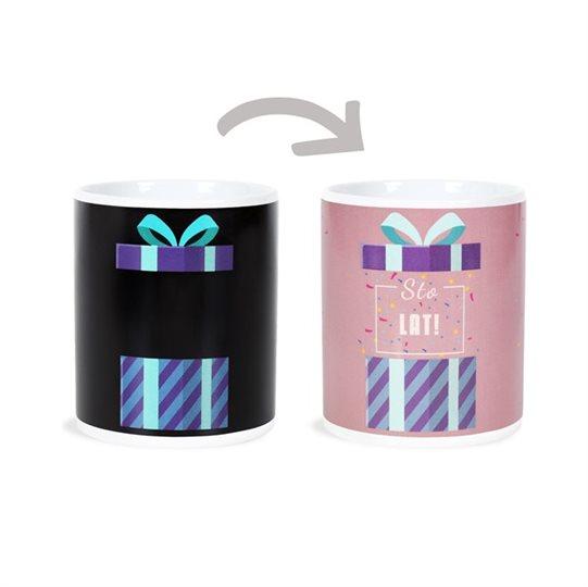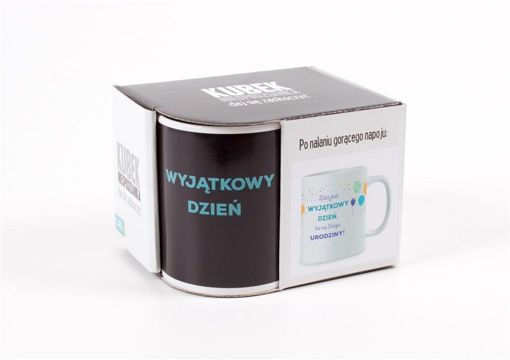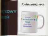 Magiczny kubek z napisem, który zmienia swoją kolorystykę pod wpływem nalania gorącego napoju.