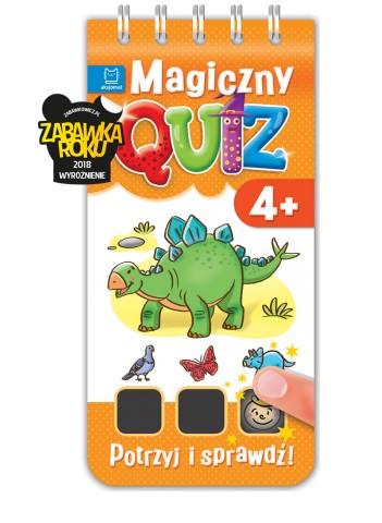 Magiczny quiz. Dotknij i sprawdź Magiczny quiz to świetna zabawa i sposób sprawdzenia wiedzy dziecka! Aby wskazać odpowiedź, należy przyłożyć palec lub delikatnie potrzeć pokryty farbą termiczną kwadracik – pod wpływem ciepła pojawi się znaczek poprawnej lub błędnej odpowiedzi. W książce zamieszczonych jest 76 pytań obrazkowych wraz z odpowiedziami. Quiz to pomysł na udany prezent i interesującą naukę.