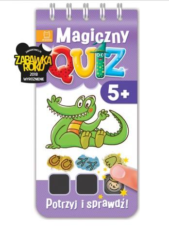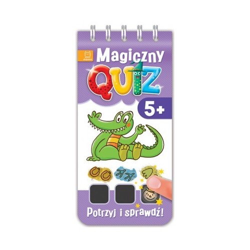Magiczny quiz. Dotknij i sprawdź Magiczny quiz to świetna zabawa i sposób sprawdzenia wiedzy dziecka! Aby wskazać odpowiedź, należy przyłożyć palec lub delikatnie potrzeć pokryty farbą termiczną kwadracik – pod wpływem ciepła pojawi się znaczek poprawnej lub błędnej odpowiedzi. W książce zamieszczonych jest 76 pytań obrazkowych wraz z odpowiedziami. Quiz to pomysł na udany prezent i interesującą naukę.