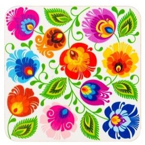 Kwadratowy magnes drewniany na lodówkę, zmywarkę, a może nawet pralkę w ludowy motyw łowicki. Folk magnes zdobią barwne kwiaty z łowickiej wycinanki na białym tle. Wzór na magnesie inspirowany jest tradycyjnym wzorem ludowym z regionu łowickiego. Elementem przewodnim na łowickich wycinankach są koguty, pawie oraz motywy kwiatowe.