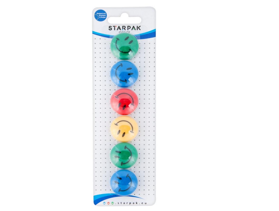 Zestaw mocnych magnesów w plastikowej obudowie w czterech kolorach o średnicy 30 mm. Każdy magnes posiada uśmiechniętą buźkę. Przydatne w biurze, domu oraz pracy. Zapoznaj się również z innymi produktami Starpak dla biura. Magnesy pakowane na blistrze po 6 szt. Wykonane z plastiku. Produkt przeznaczony dla dzieci w wieku: 3+.