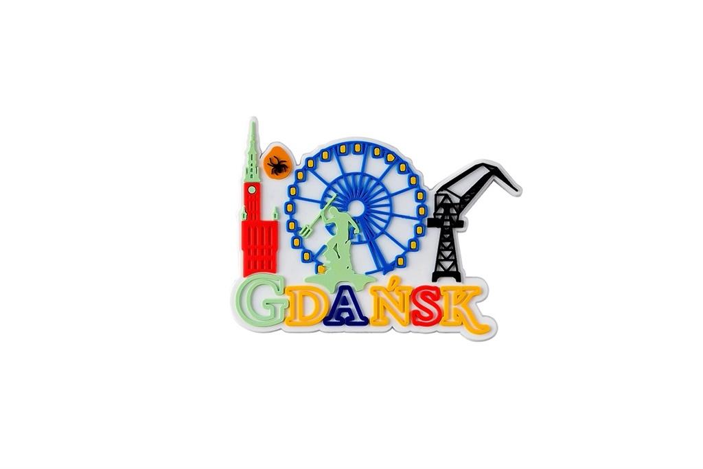 Miastowy magnes gumowy - Gdańsk symbole: biały z nadrukowanymi symbolami charakterystycznymi dla miasta Gdańsk,wykonany z materiału PVC,o nieregularnym kształcie,z wypukłum nadrukiem,zapakowany w folijkę,