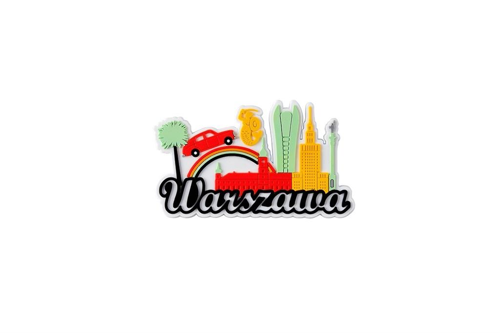 Miastowy magnes gumowy - Warszawa symbole: biały z nadrukowanymi symbolami charakterystycznymi dla miasta Warszawy,wykonany z materiału PVC,o nieregularnym kształcie,z wypukłum nadrukiem,zapakowany w folijkę,