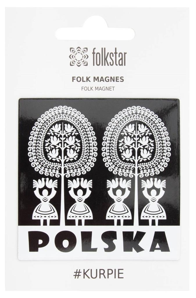 czarny z elementami kurpiowskiej wycinanki z napisem POLSKA w intensywnych kolorach, pokryty połyskującą folią,cienki ok. 1,5 mm,nadruk cyfrowy - zainspirowany tradycyjną wycinanką kurpiowską,zdobienia na folk magnesie stylizowane na ludowo,wzorem ludowym są kurpiowskie motywy drzew i kobiet,zapakowany w folijkę,magnesy ludowe to oryginalna i drobna pamiątka z Polski,doskonały upominek w stylu folk dla każdego