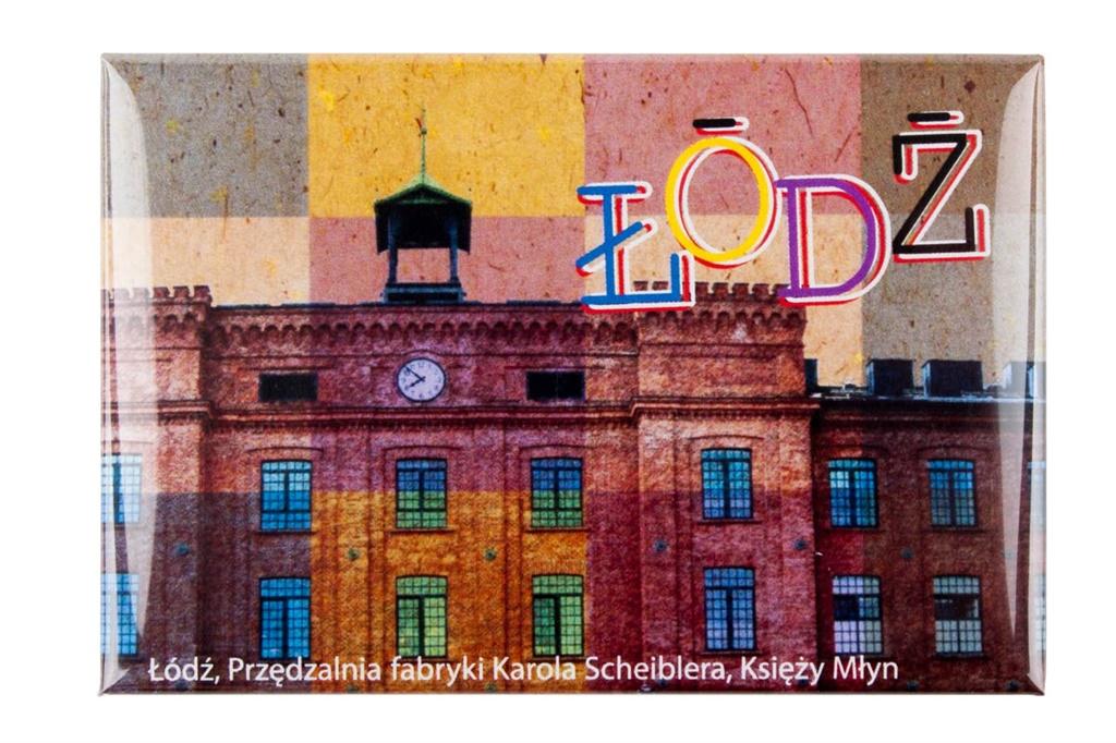 Miastowy magnes - Łódź Księży Młyn przędzalnia: w żywych kolorach wykonany z zalaminowanego metalu,w kształcie lekko wypukłego prostokątu,