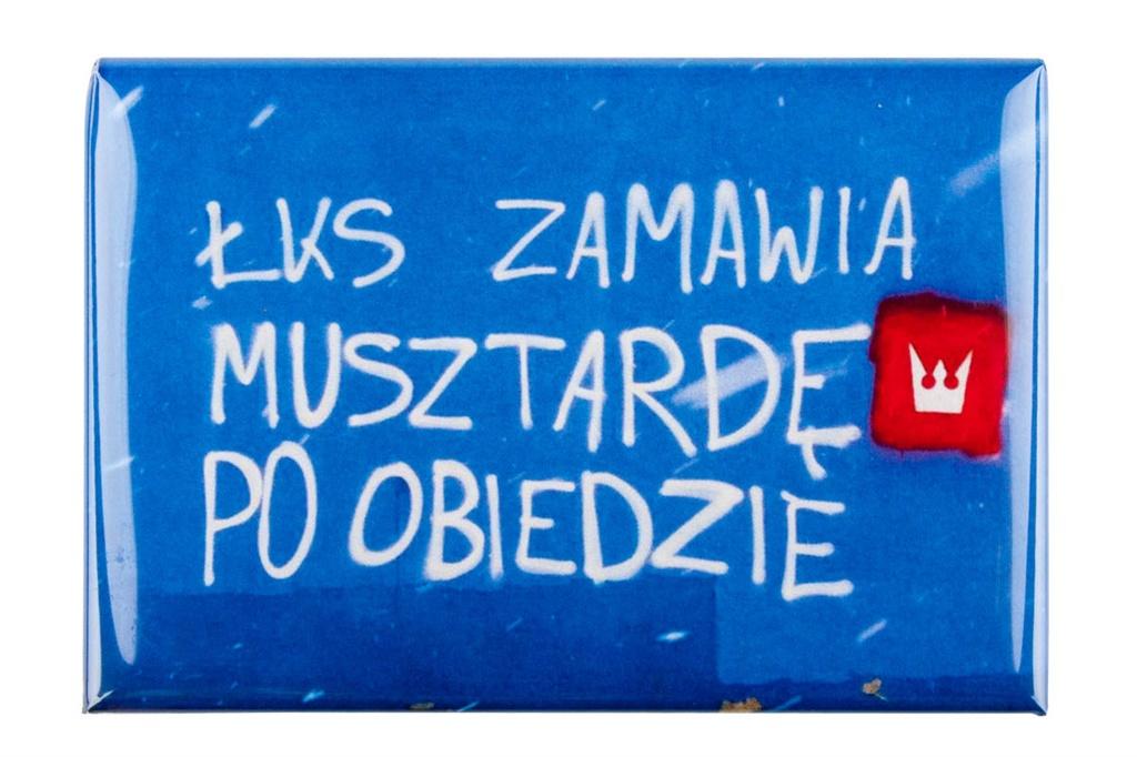 Kibicowski magnes z serii napisy na murach miasta Łodzi - ""ŁKS zamawia musztardę po obiedzie"": wykonany z zalaminowanego metalu,w kształcie lekko wypukłego prostokątu,posiada kibicowskie napisy, dowcipne zaczepki,