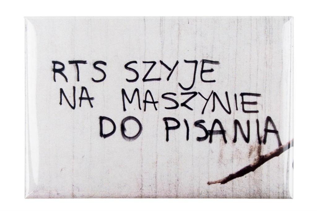 Kibicowski magnes z serii napisy na murach miasta Łodzi - ""RTS szyje na maszynie do pisania: wykonany z zalaminowanego metalu,w kształcie lekko wypukłego prostokątu,posiada kibicowskie napisy, dowcipne zaczepki,kibiców wrogich klubów piłki nożnej (RTS-u i ŁKS-u),nadruk cyfrowy