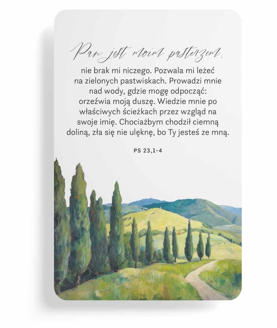 Pan jest moim pasterzem, nie brak mi niczego. Pozwala mi leżeć na zielonych pastwiskach. Prowadzi mnie nad wody, gdzie mogę odpocząć; orzeźwia moją duszę. Wiedzie mnie po właściwych ścieżkach przez wzgląd na swoje imię. Chociażbym chodził ciemną doliną, zła się nie ulęknę, bo Ty jesteś ze mną.