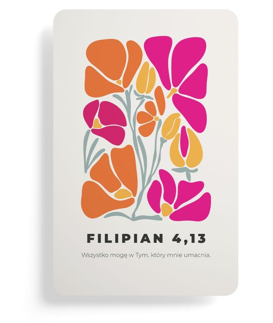 Wyraziste, kwiatowe wzory i werset przypominają o radości i sile płynącej z wiary w Boga, który umacnia każdego dnia.
