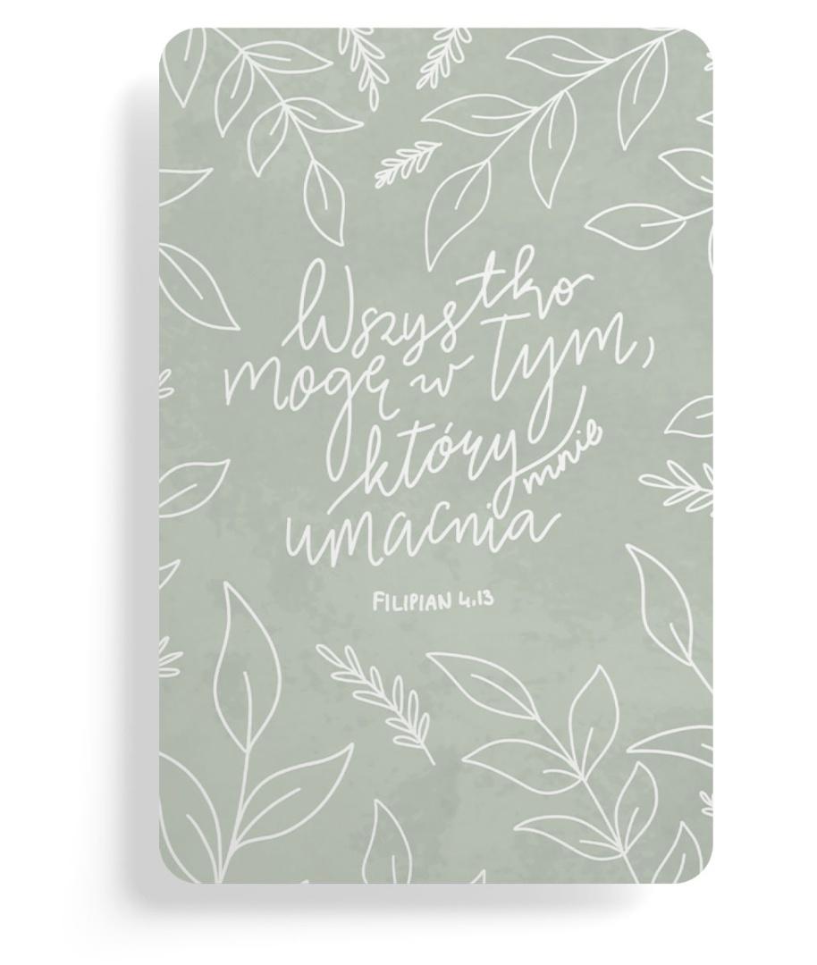 Magnes z popularnym cytatem z Listu do Filipian 4,13 - pełen nadziei i mocy Bożego wsparcia. Utrzymany w delikatnej, roślinnej stylistyce, będzie piękną ozdobą w domu lub biurze.