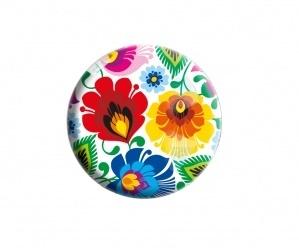 Folk magnes zdobią barwne kwiaty z łowickiej wycinanki na czarnym tle. Wzór ten inspirowany jest tradycyjnym wzorem ludowym z regionu łowickiego. Elementem przewodnim na łowickich wycinankach są koguty, pawie oraz motywy kwiatowe.