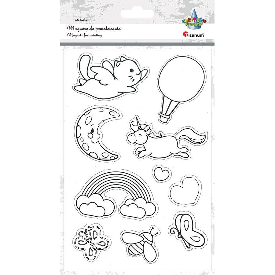 Zestaw 10 magnesów pokrytych papierem z motywami gotowymi do pokolorowania, 10 wzorów. Wymiary planszy: 140 x 210 mm.