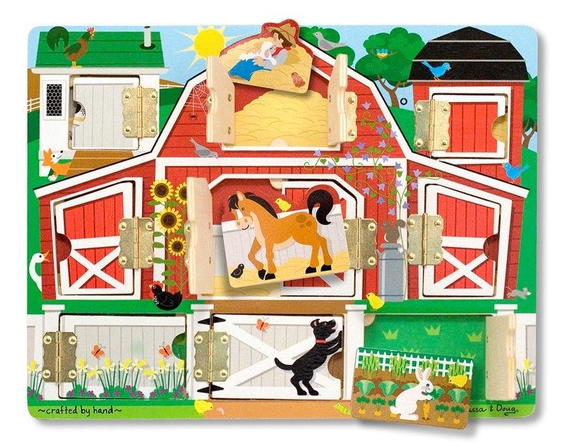 Drewniana makieta domu oraz miejsc wokół domu, którego tajemnice są strzeżone przez dziewięć drzwi, otwieranych przez odchylenie na zawiasach, nie ma tutaj żadnych zamków. Maluch koniecznie chce zajrzeć, co znajduje się za drzwiami. Jak się okazuje, po otwarciu, we wnęce mieszka jakieś zwierzątko. Dzięki magnesowi nie wypada ze swojego miejsca, zabawka może być również trzymana w pozycji pionowej. Ta gra pomaga w zdolnościach manualnych, ćwiczeniu małej motoryki, może być to też zabawa typu ,,memo""dla starszych dzieci, nauka zapamiętania, gdzie które zwierzątko mieszka.