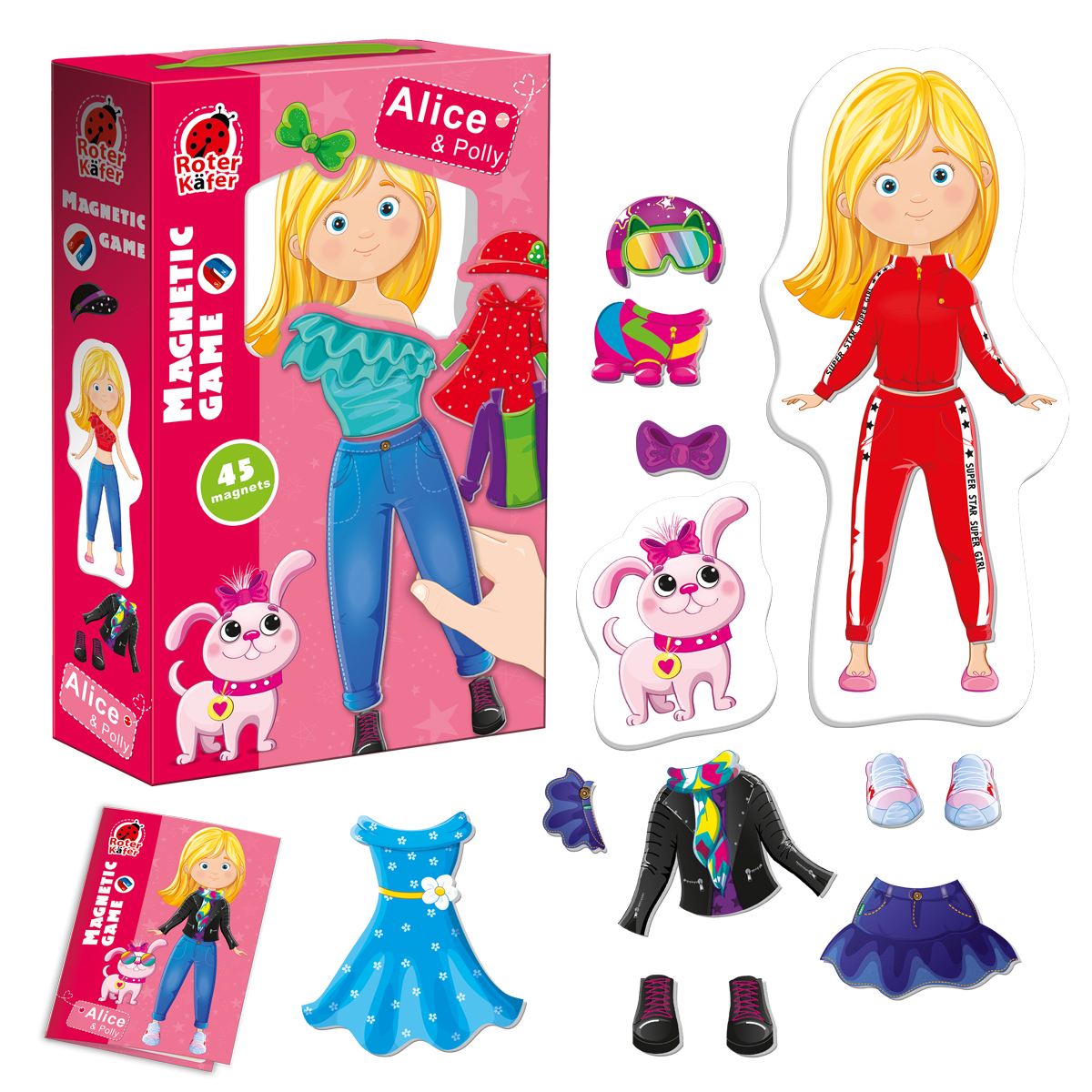 W zestawie są 2 lalki – Alice i jej piesek Polly, a także różnorodne magnesowe ubrania i akcesoria dla tworzenia oryginalnych obrazów.