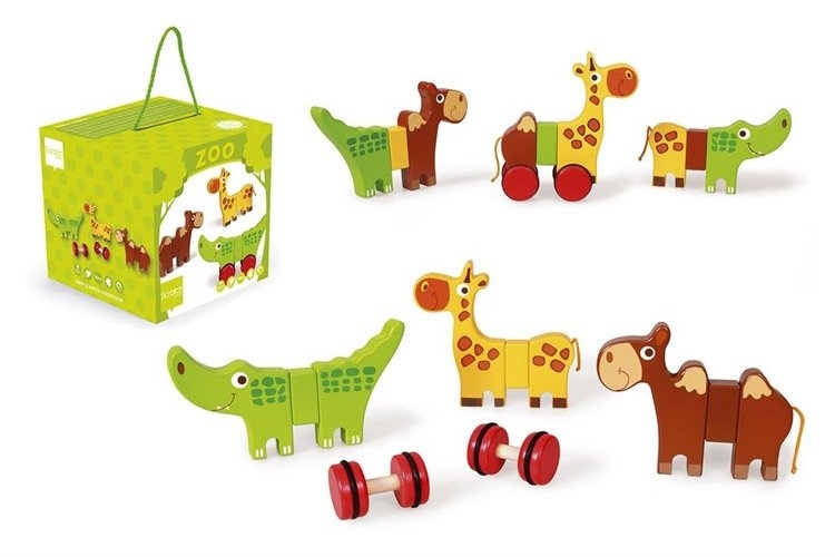 Po złożeniu zwierzątka można też doczepić kółka i otrzymać jeżdzącą zabawkę. Produkt wykonany z drewna.