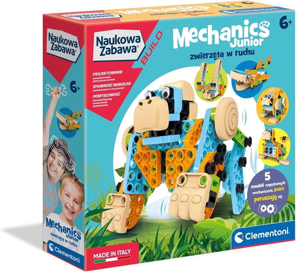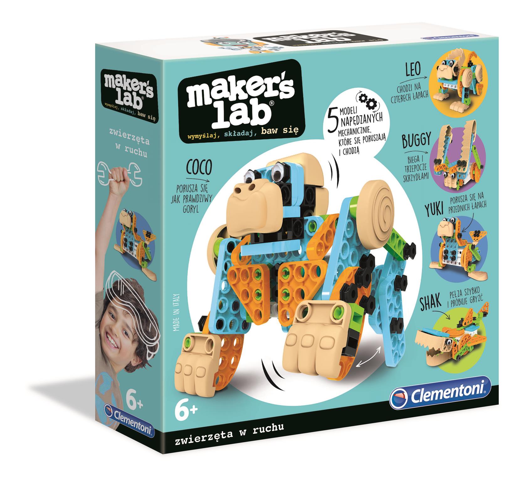 Wynalazki, budowa, zabawa! Przeznaczone dla małych dzieci Maker Lab zapoznające z zasadami mechaniki zawiera mnóstwo elementów, które można łatwo łączyć, tworząc fantastyczne zwierzęta, które poruszają się i chodzą. Zabawka zawiera 120 elementów: belki, płyty, gwoździe, kostki, bloczki i elementy specjalne (elipsy, łuki i trójkąty).Moduł napędzany silnikiem umożliwi poruszanie się każdego zmontowanego modelu. Instrukcja pomoże skonstruować 5 modeli zabawnych zwierząt: goryla, lwa, foki, rekina i owada. Reszta zależy od Twojej wyobraźni! Aby zainicjować ruch, wystarczy uruchomić silnik, a wtedy... goryl zaczyna chodzić, owad uderza skrzydłami, rekin próbuje Cię dogonić, foka pełznie niezdarnie do przodu, a lew startuje do biegu. W Maker Lab zabawa nigdy się nie kończy: składaj, baw się, rozkładaj i od nowa buduj zabawne zwierzęta w najlepszym laboratorium dla małych konstruktorów! Dla dzieci w wieku od 6 lat