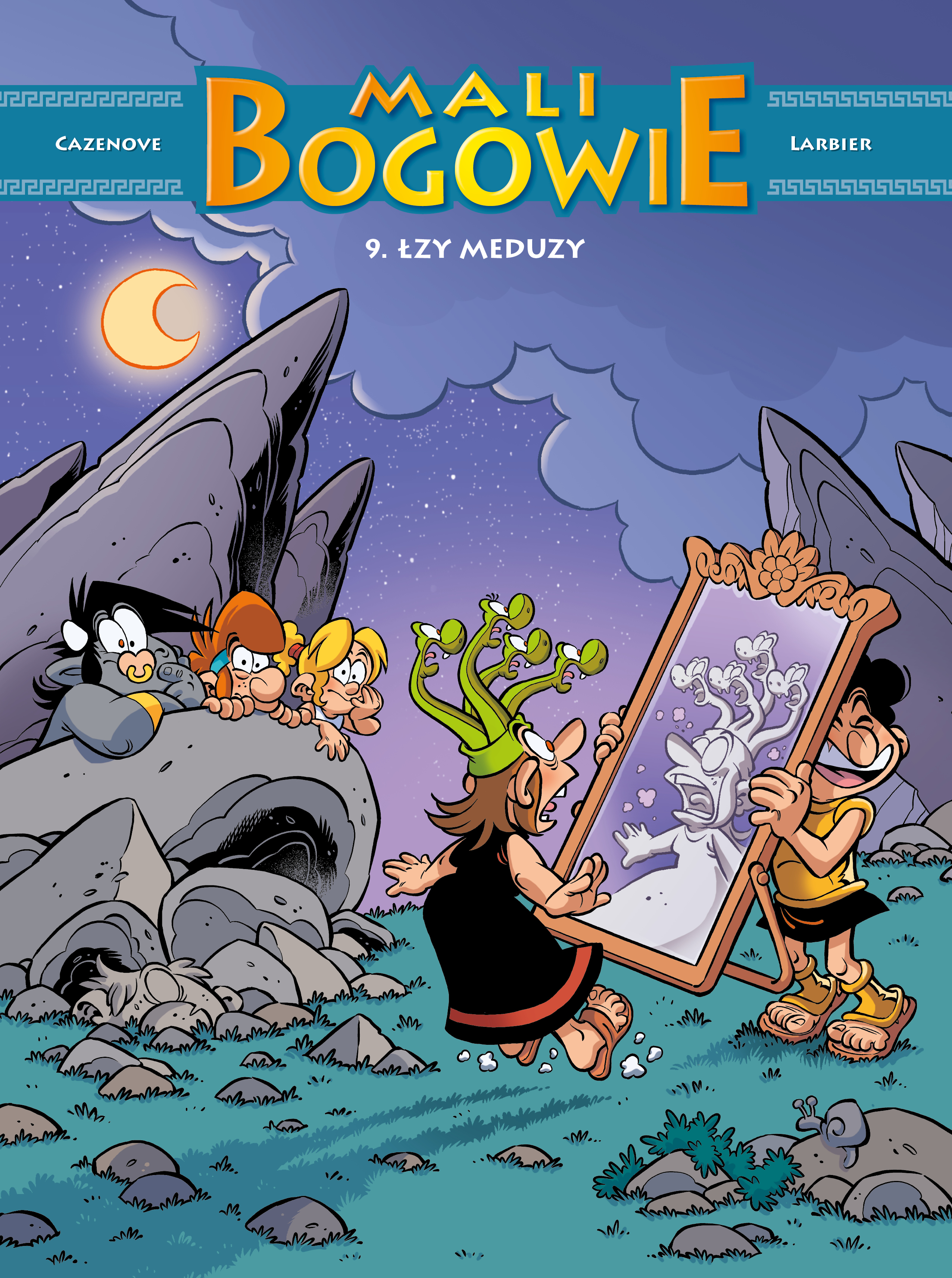 Dziewiąta część wesołych przygód niezbyt rozgarniętych kandydatów na bogów i herosów starożytnego Olimpu. Meduza jest załamana tym, że każdy człowiek, który spojrzy jej w oczy, zamienia się w kamień. W dodatku pojawia się Perseusz z zadaniem zdobycia głowy sympatycznej wężowej potworzycy. Na szczęście śmiałek nie grzeszy skutecznością. Jak zwykle rozśmieszą nas też żarłok Taurusek, nieporadny Herakles, nieznający się na żeglowaniu Odyseusz czy pomysłowy wynalazca Hefajstos. Autorami historii o psotnych istotach z mitów są scenarzysta Christophe Cazenove, znany w Polsce między innymi z bestsellerowej serii "Sisters", oraz rysownik Philippe Larbier, który stworzył ilustracje do takich humorystycznych opowieści jak "Chats, chats, chats" czy "Nina" oraz scenariusz kryminalnego cyklu dla dzieci "Les Enigmes de La".