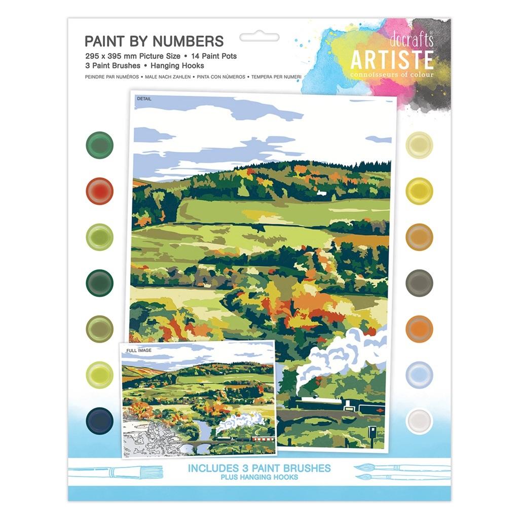 Zestaw zawiera: tekturowe podobrazie 395 x 295 x 2 mm, 14 pojemników z farbą akrylową i 3 pędzelki.