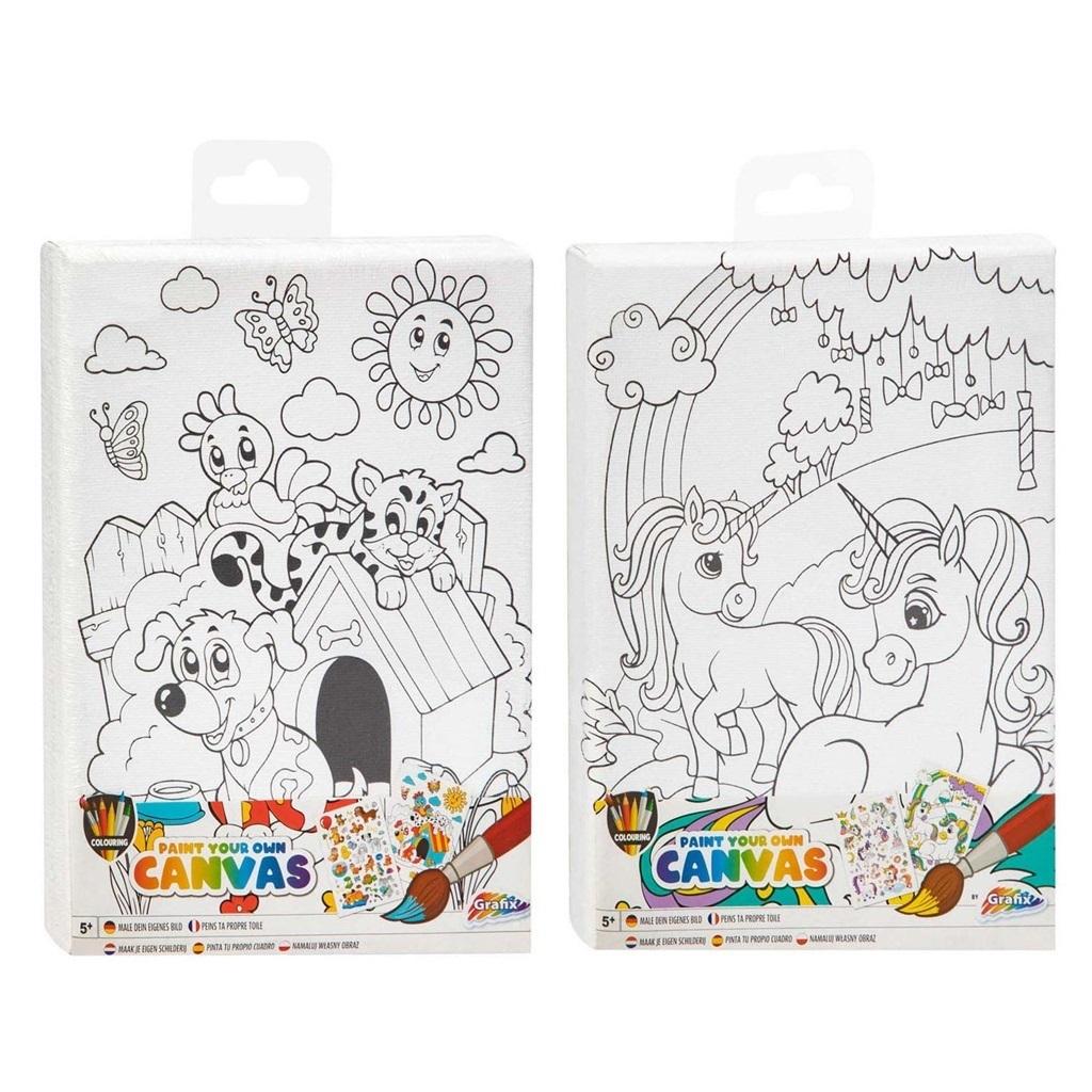 Płótno z rysunkami dostępne jest w 2 wariantach (z jednorożcem lub pieskiem). Każdy rysunek posiada 3 farbki w różnych kolorach, pędzel, naklejki. Produkt rozwija zdolności manualne oraz dokładność.