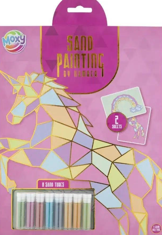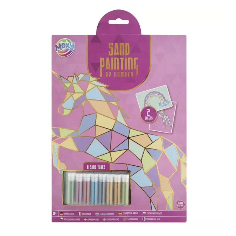 Malowanie piaskiem po numerach, na formacie A4. Wariant: Jednorożec. W zestawie 8 fiolek kolorowego piasku niezbędnego do wypełnienia kolorem pokrytych klejem obrazków. Super kreatywna zabawa dla dzieci powyżej 5 lat.