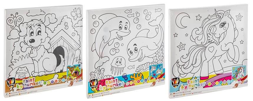 W każdym znajdują się 2 pędzelki. 6 pojemniczków farb w różnych kolorach. Produkt rozwija zdolności manualne oraz kreatywne myślenie. Każde płótno mierzy 30 x 30 cm.