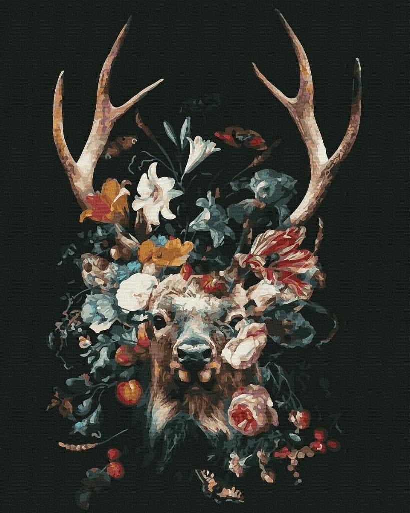 Natura w najpiękniejszym wydaniu jeleń z porożem wypełnionym kwiatami i owocami. Obraz symbolizujący harmonię między siłą a pięknem.