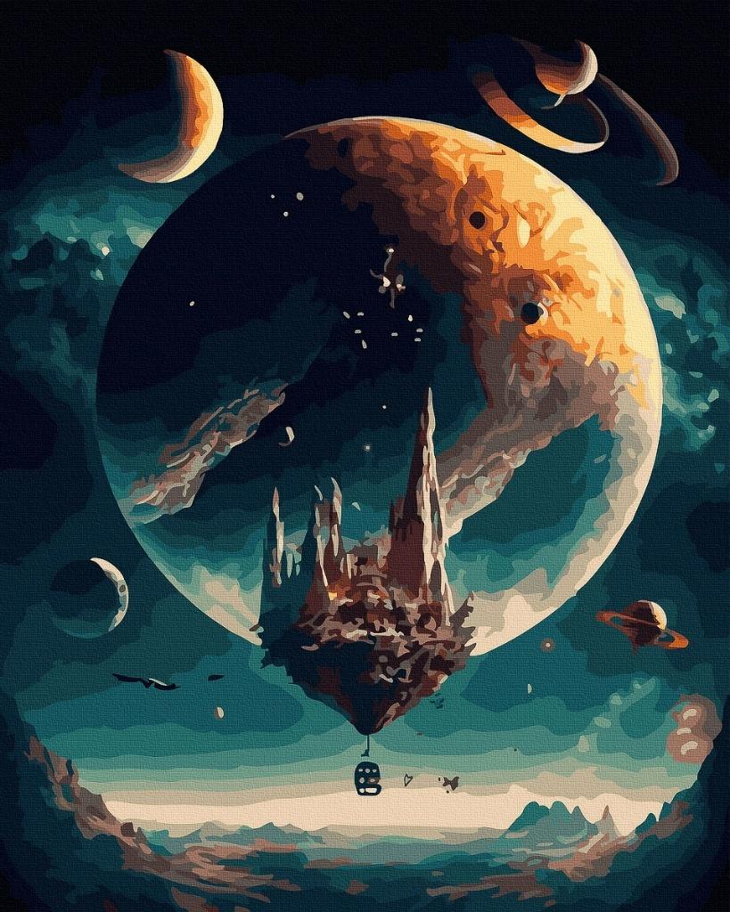 Fantastyczny pejzaż z innego wymiaru unosząca się wyspa pod tajemniczą planetą, pierścienie Saturna i odległe galaktyki. Ten obraz przenosi wyobraźnię w głąb kosmosu, inspirując marzenia i fascynację nieznanym.
