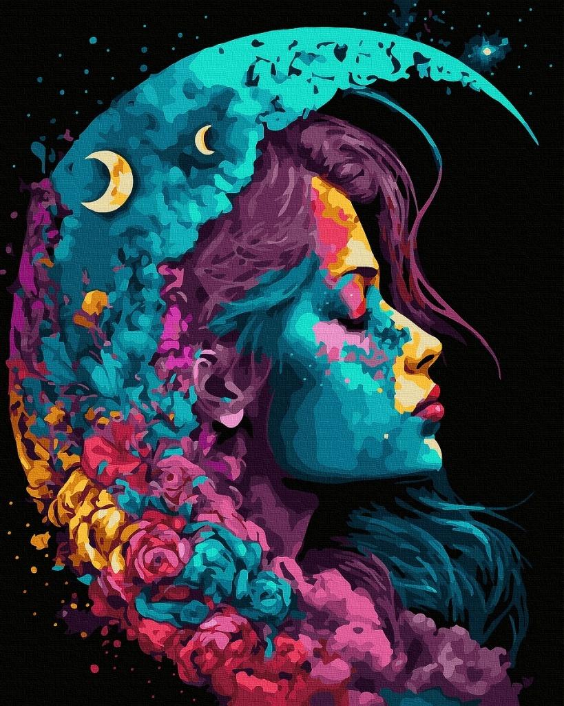 Ta hipnotyzująca kompozycja przedstawia profil kobiety otulonej księżycem i kosmiczną mgławicą, splecioną z barwnych róż. Jej spojrzenie skierowane ku gwiazdom symbolizuje marzenia, intuicję i wewnętrzną siłę. Idealna propozycja dla miłośników sztuki z nutą magii i tajemnicy.