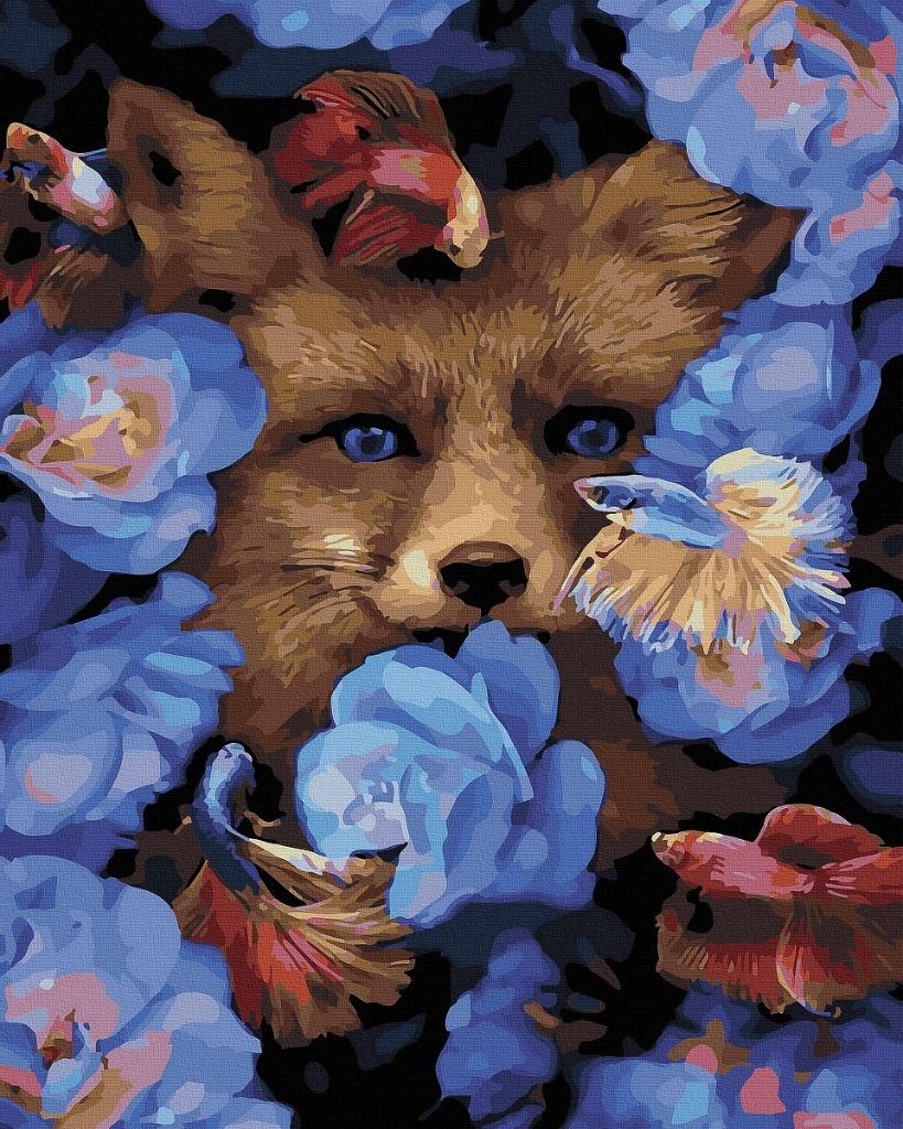 Zaczarowany lis ukryty w błękitnych kwiatach, otoczony kolorowymi rybkami. Bajkowa scena, która przenosi do magicznego świata natury i wyobraźni.