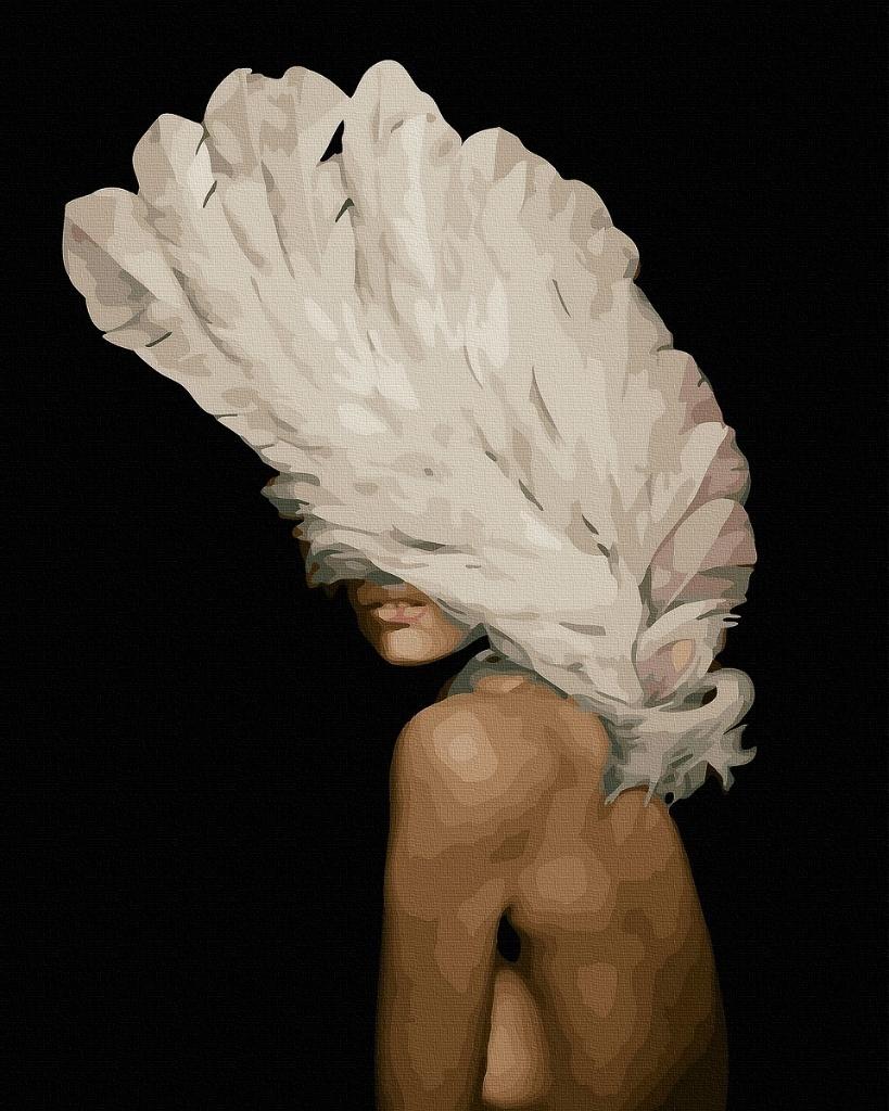 Tajemniczy akt kobiecy z wielkimi, białymi skrzydłami zakrywającymi twarz. Obraz łączy delikatność z odwagą i subtelną zmysłowością.