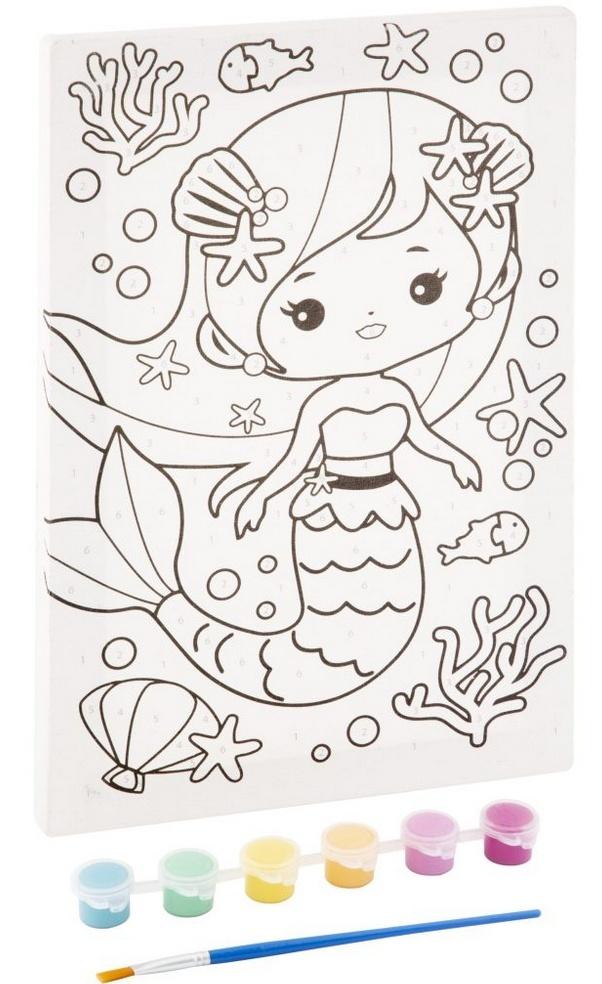 Malowanie po numerach. Wymiary rysunku: 29,7 x 19,5 cm z nadrukowanymi konturami. Wzór: Syrenka