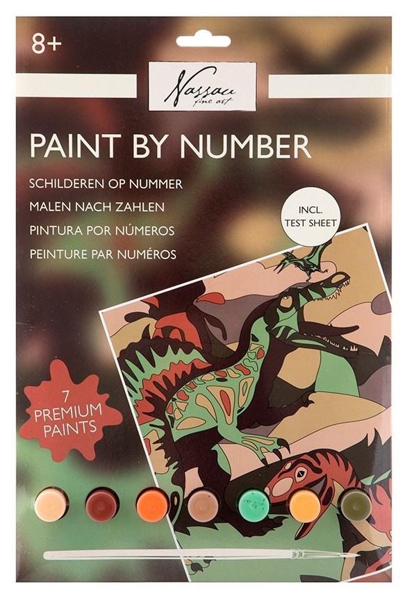 - W zestawie znajdują się 2x obrazy dinozaurai o wymiarach 33,523,8 - Jeden obraz jest na zwykłej kartce, a drugi na sztywnej tekturze - 7x farbek, które mają przypisane numerki