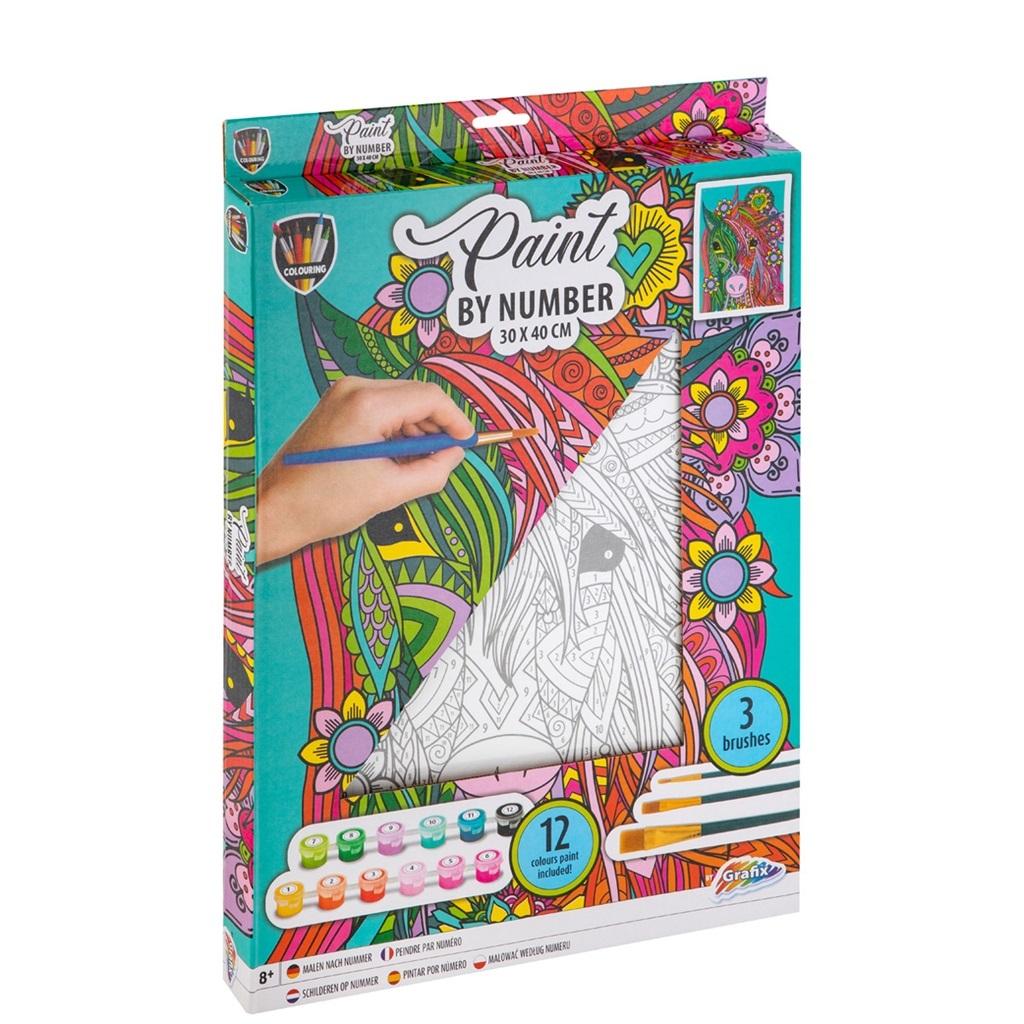 - W zestawie znajduje się płótno z nadrukiem jednorożca o wymiarach 30x40cm, na którym są numerki - 12x farbek, które mają przypisane numerki, dzięki, którym łatwiej będzie pomalować obraz - 3x pędzelki